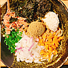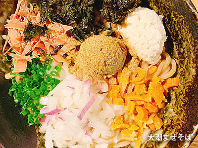あおさのり、ミル貝、にぼ玉、貝ペーストなどを混ぜる大潮まぜそば、